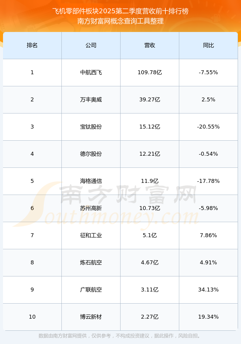 按照南方财富网概念查询工具统计,该股所属板块为飞机零部件板块,该板块共有11只股票,立航科技2025第二季度营收在该板块中排名为第11名,该板块2025第二季度营收排名前十的股票如下表: