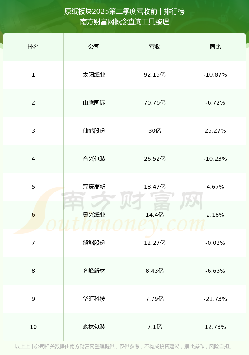 按照南方财富网概念查询工具统计,该股所属板块为原纸板块,该板块共有18只股票,山鹰国际2025第二季度营收在该板块中排名为第2名,该板块2025第二季度营收排名前十的股票如下表: