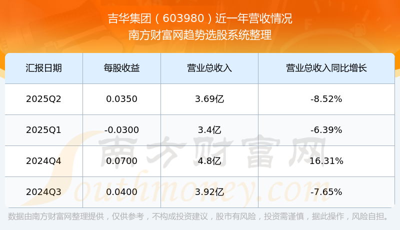 吉华集团2025年第二季度公司实现营业收入3.69亿元,同比-8.52%;归母净利润2422.7万元,同比472.35%。