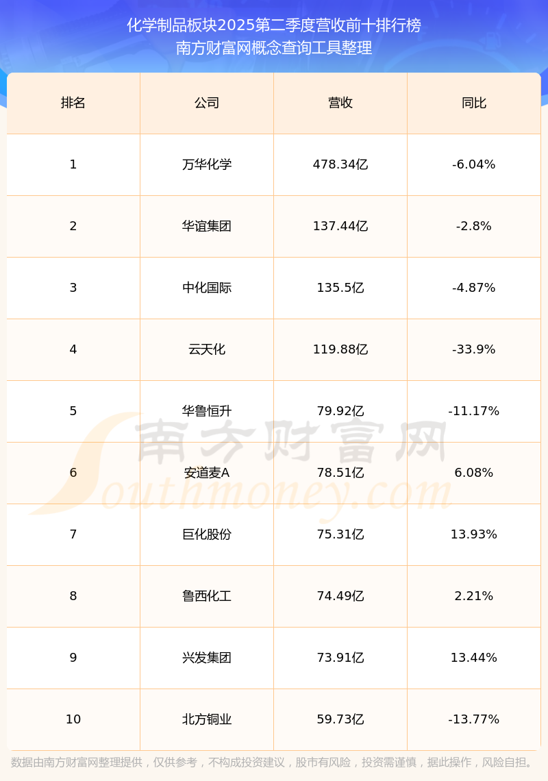 按照南方财富网概念查询工具统计,该股所属板块为化学制品板块,该板块共有226只股票,吉华集团2025第二季度营收在该板块中排名为第132名,该板块2025第二季度营收排名前十的股票如下表: