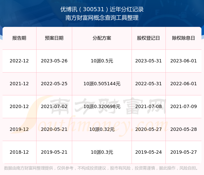 优博讯最新一次公布的分红方案为10派0.5元。本次权益分派股权登记日为2023年5月31日,除权除息日为2023年6月1日,派息日为2023年6月1日。