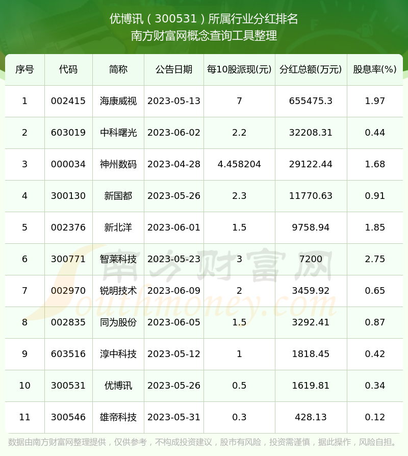按照南方财富网趋势选股系统统计,优博讯所属行业为计算机设备行业,计算机设备行业分红排名情况如下表: