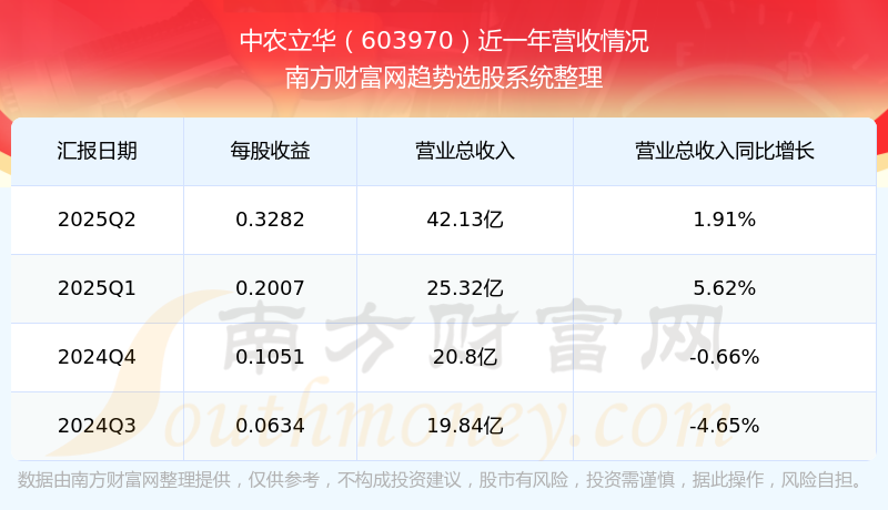 中农立华2025年第二季度显示,公司主营收入42.13亿元,同比1.91%;归母净利润8824.39万元,同比-12.85%;扣非净利润8595.76万元,同比-13.27%;