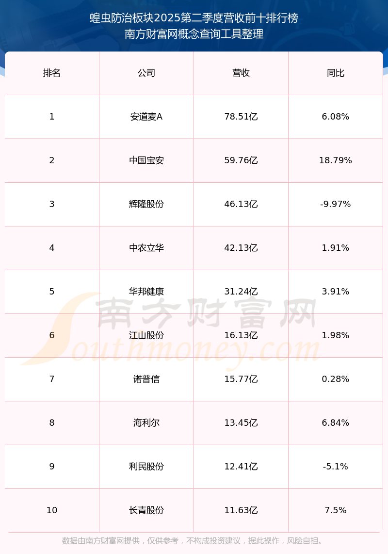 按照南方财富网概念查询工具统计,该股所属板块为蝗虫防治板块,该板块共有16只股票,中农立华2025第二季度营收在该板块中排名为第4名,该板块2025第二季度营收排名前十的股票如下表: