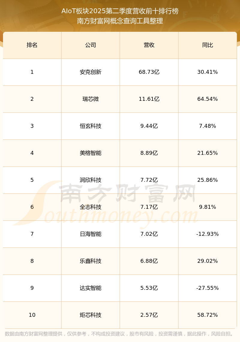 按照南方财富网概念查询工具统计,该股所属板块为AIoT板块,该板块共有11只股票,龙旗科技2025第二季度营收在该板块中排名为第11名,该板块2025第二季度营收排名前十的股票如下表:
