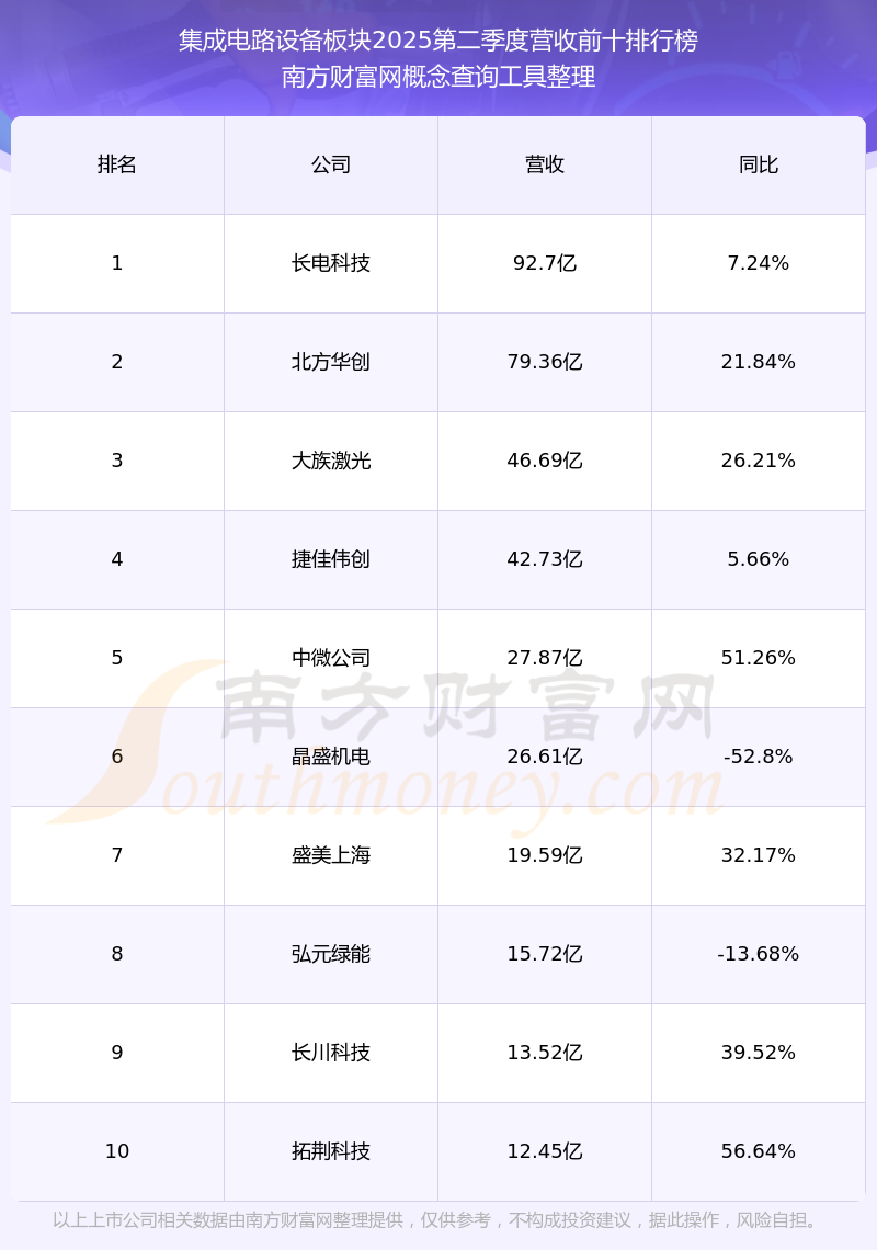 按照南方财富网概念查询工具统计,该股所属板块为集成电路设备板块,该板块共有25只股票,中微公司2025第二季度营收在该板块中排名为第5名,该板块2025第二季度营收排名前十的股票如下表: