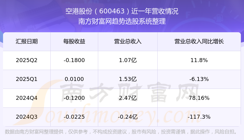 空港股份(600463)披露2025年第二季度报告,报告期实现营收1.07亿元,同比11.8%;归母净利润-5609.99万元,同比-18.93%;扣非净利润-5527.83万元,同比-26%。