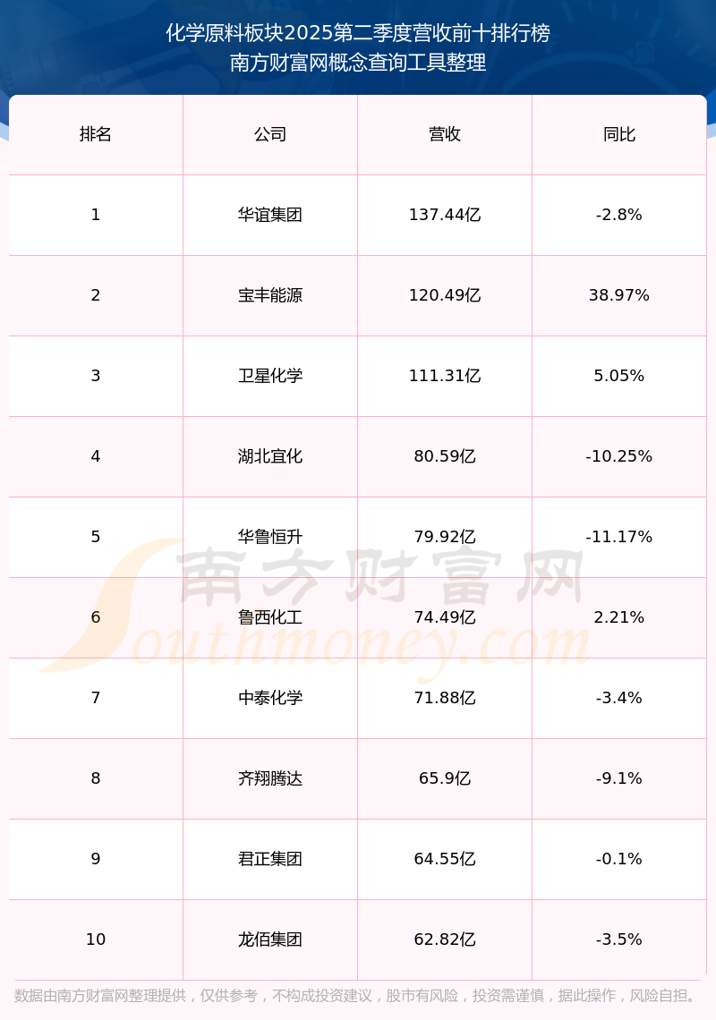 按照南方财富网概念查询工具统计,该股所属板块为化学原料板块,该板块共有105只股票,和邦生物2025第二季度营收在该板块中排名为第22名,该板块2025第二季度营收排名前十的股票如下表:
