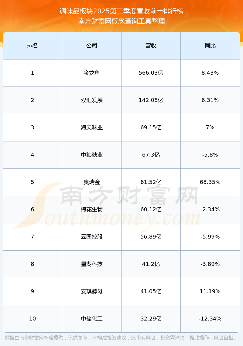 按照南方财富网概念查询工具统计,该股所属板块为调味品板块,该板块共有52只股票,中炬高新2025第二季度营收在该板块中排名为第21名,该板块2025第二季度营收排名前十的股票如下表: