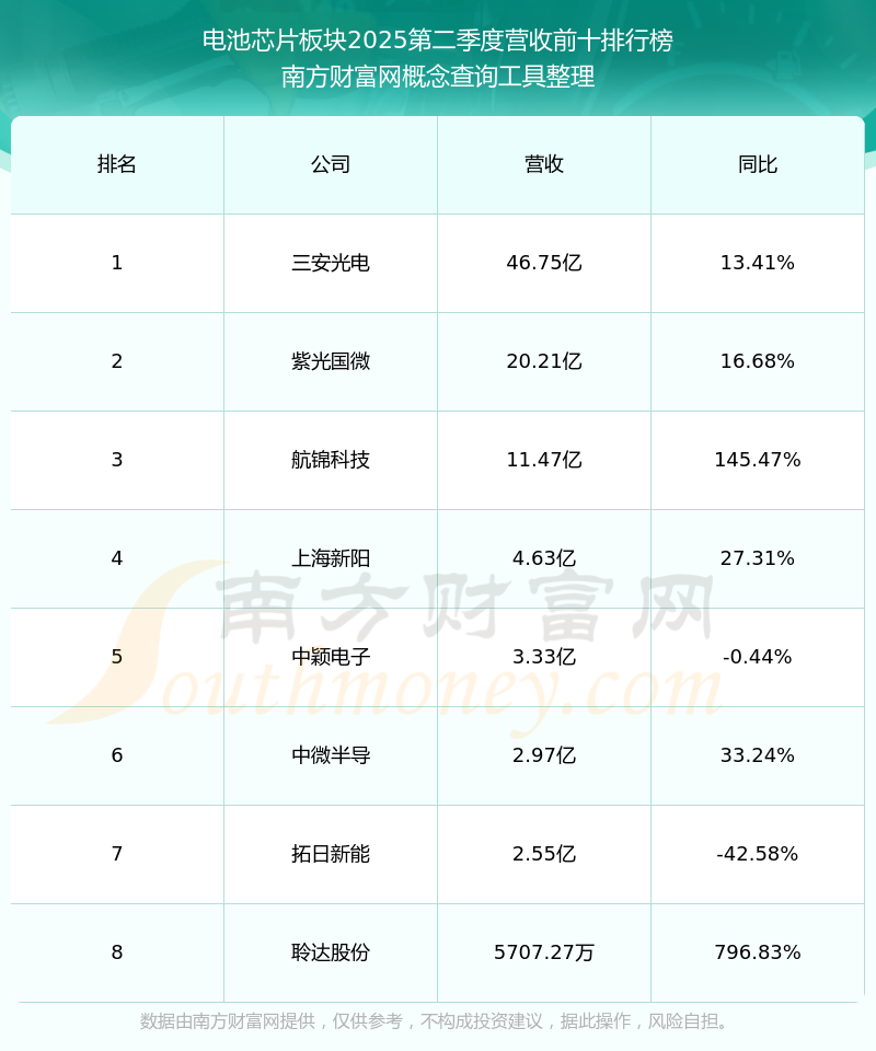 按照南方财富网概念查询工具统计,该股所属板块为电池芯片板块,该板块共有8只股票,赛微微电2025第二季度营收在该板块中排名为第8名,该板块2025第二季度营收排名前十的股票如下表: