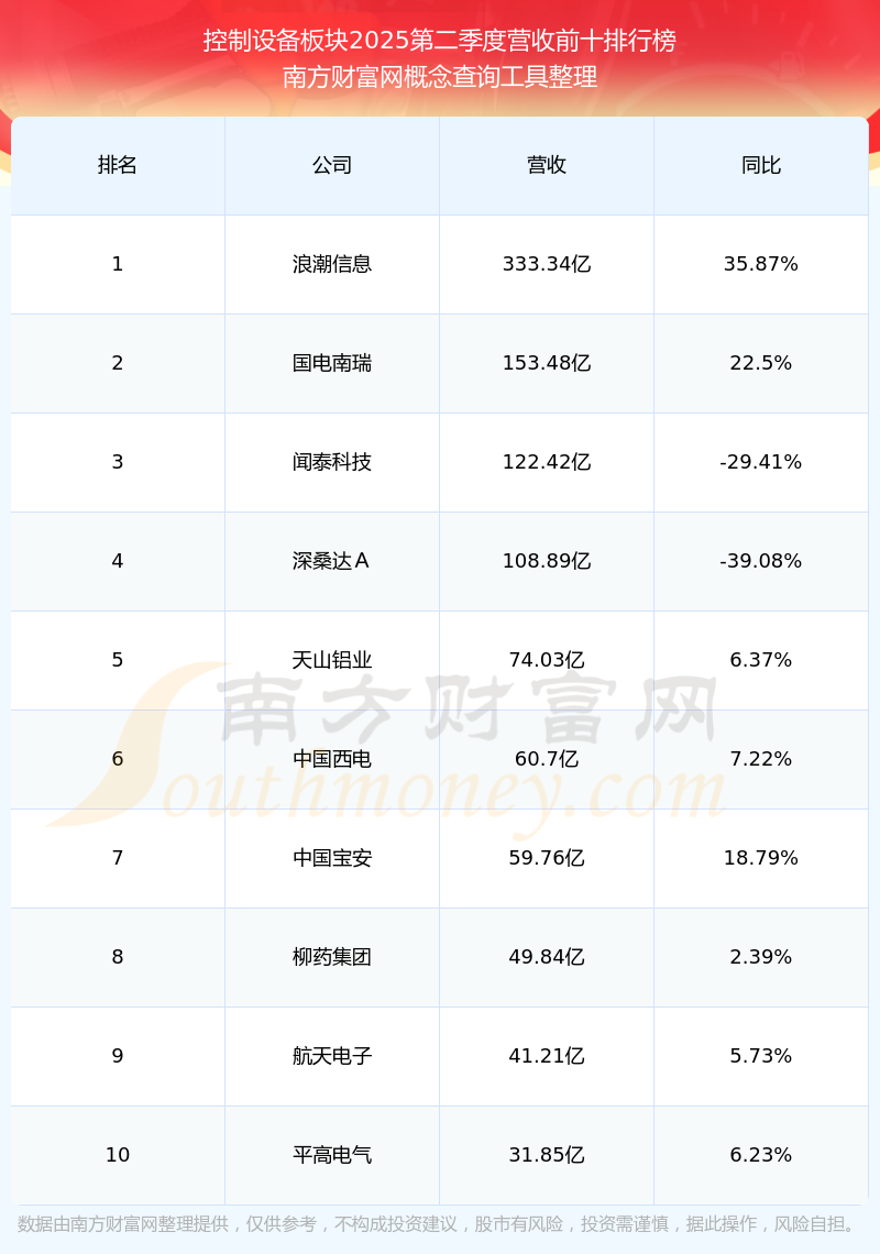 按照南方财富网概念查询工具统计,该股所属板块为控制设备板块,该板块共有66只股票,公牛集团2025第二季度营收在该板块中排名为第66名,该板块2025第二季度营收排名前十的股票如下表: