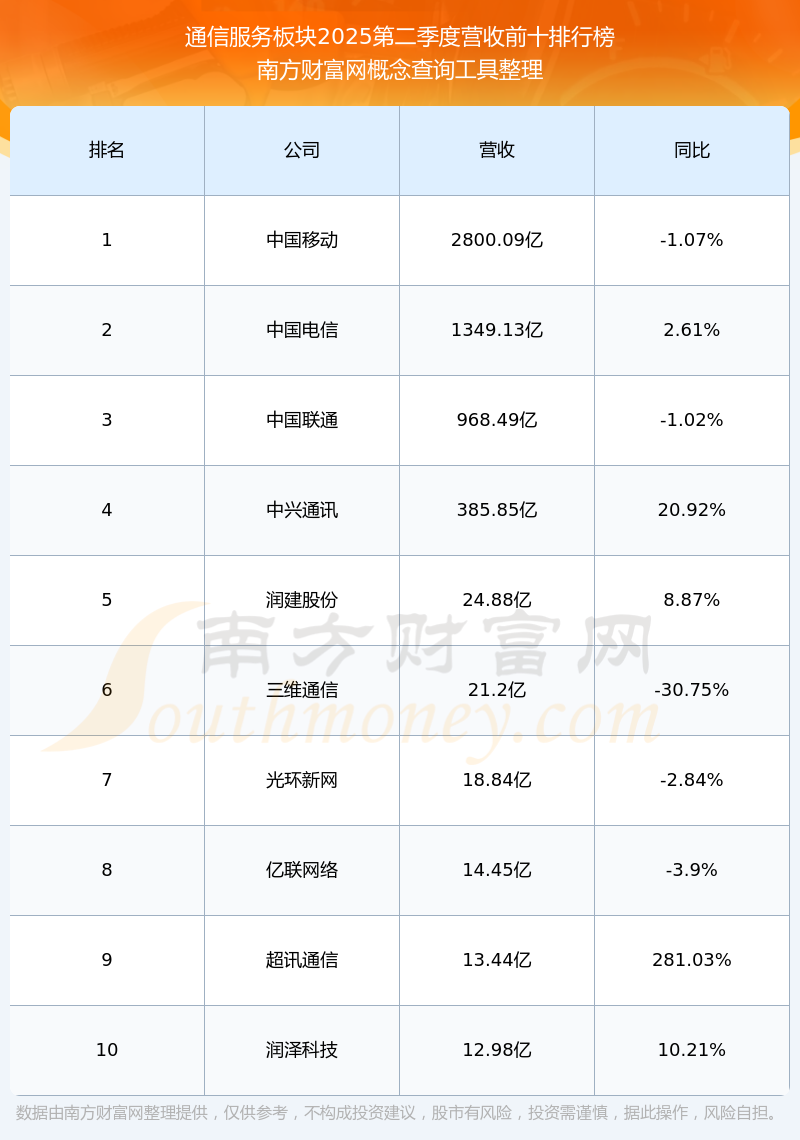按照南方财富网概念查询工具统计,该股所属板块为通信服务板块,该板块共有48只股票,中国移动2025第二季度营收在该板块中排名为第1名,该板块2025第二季度营收排名前十的股票如下表:
