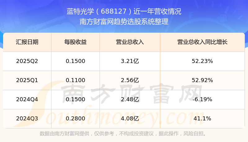 按照南方财富网概念查询工具统计,该股所属板块为光学棱镜板块,该板块共有2只股票,蓝特光学2025第二季度营收在该板块中排名为第2名,该板块2025第二季度营收排名前十的股票如下表:
