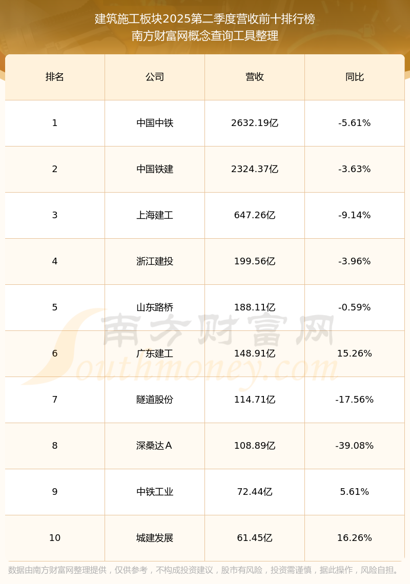 按照南方财富网概念查询工具统计,该股所属板块为建筑施工板块,该板块共有29只股票,汇通控股2025第二季度营收在该板块中排名为第26名,该板块2025第二季度营收排名前十的股票如下表: