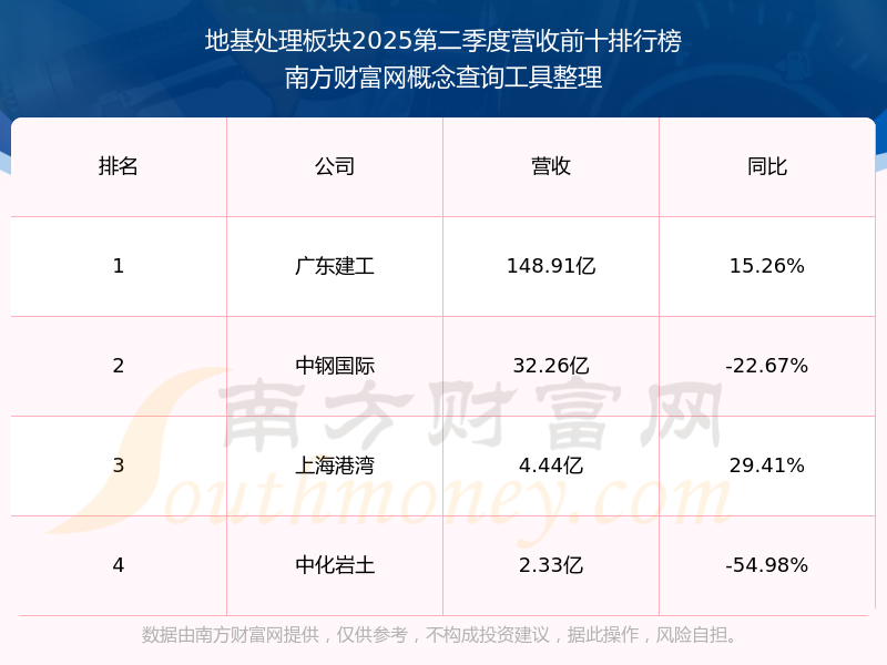 按照南方财富网概念查询工具统计,该股所属板块为地基处理板块,该板块共有4只股票,上海港湾2025第二季度营收在该板块中排名为第3名,该板块2025第二季度营收排名前十的股票如下表: