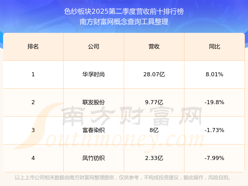 按照南方财富网概念查询工具统计,该股所属板块为色纱板块,该板块共有4只股票,富春染织2025第二季度营收在该板块中排名为第3名,该板块2025第二季度营收排名前十的股票如下表: