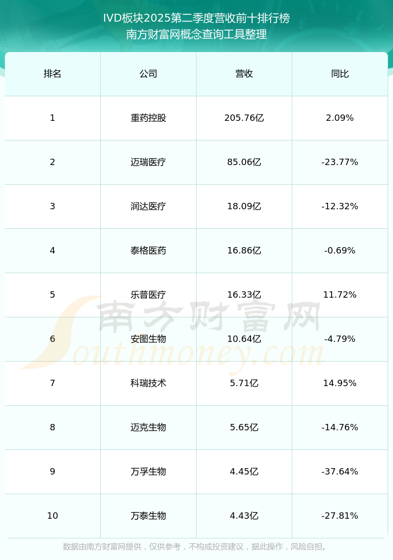 按照南方财富网概念查询工具统计,该股所属板块为IVD板块,该板块共有24只股票,塞力医疗2025第二季度营收在该板块中排名为第14名,该板块2025第二季度营收排名前十的股票如下表: