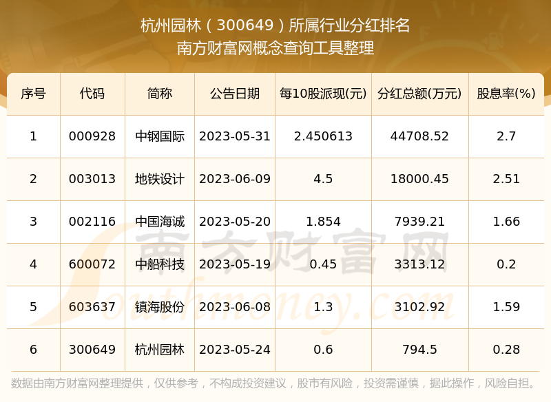 按照南方财富网趋势选股系统统计,杭州园林所属行业为工程承包行业,工程承包行业分红排名情况如下表: