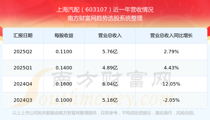 上海汽配(603107)披露2025年第二季度报告,报告期实现营收5.76亿元,同比2.79%;归母净利润3784.86万元,同比-32.53%;扣非净利润4685.04万元,同比7.93%;基本每股收益0.11元。