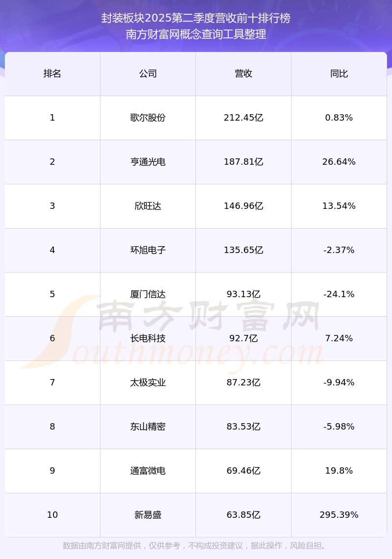 按照南方财富网概念查询工具统计,该股所属板块为封装板块,该板块共有53只股票,甬矽电子2025第二季度营收在该板块中排名为第53名,该板块2025第二季度营收排名前十的股票如下表:
