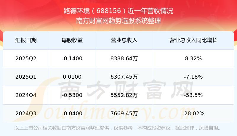 路德环境发布2025年第二季度财报。实现总营收8388.64万元,同比增长8.32%;扣非净利润同比增长-211.38%至-1502万元。