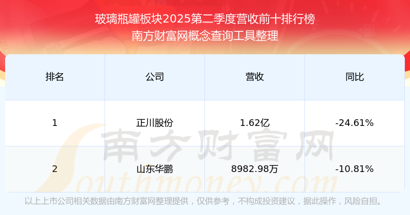按照南方财富网概念查询工具统计,该股所属板块为玻璃瓶罐板块,该板块共有2只股票,山东华鹏2025第二季度营收在该板块中排名为第2名,该板块2025第二季度营收排名前十的股票如下表: