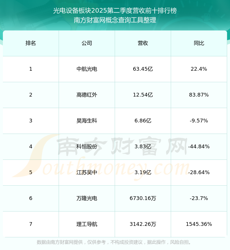 按照南方财富网概念查询工具统计,该股所属板块为光电设备板块,该板块共有7只股票,新光光电2025第二季度营收在该板块中排名为第7名,该板块2025第二季度营收排名前十的股票如下表: