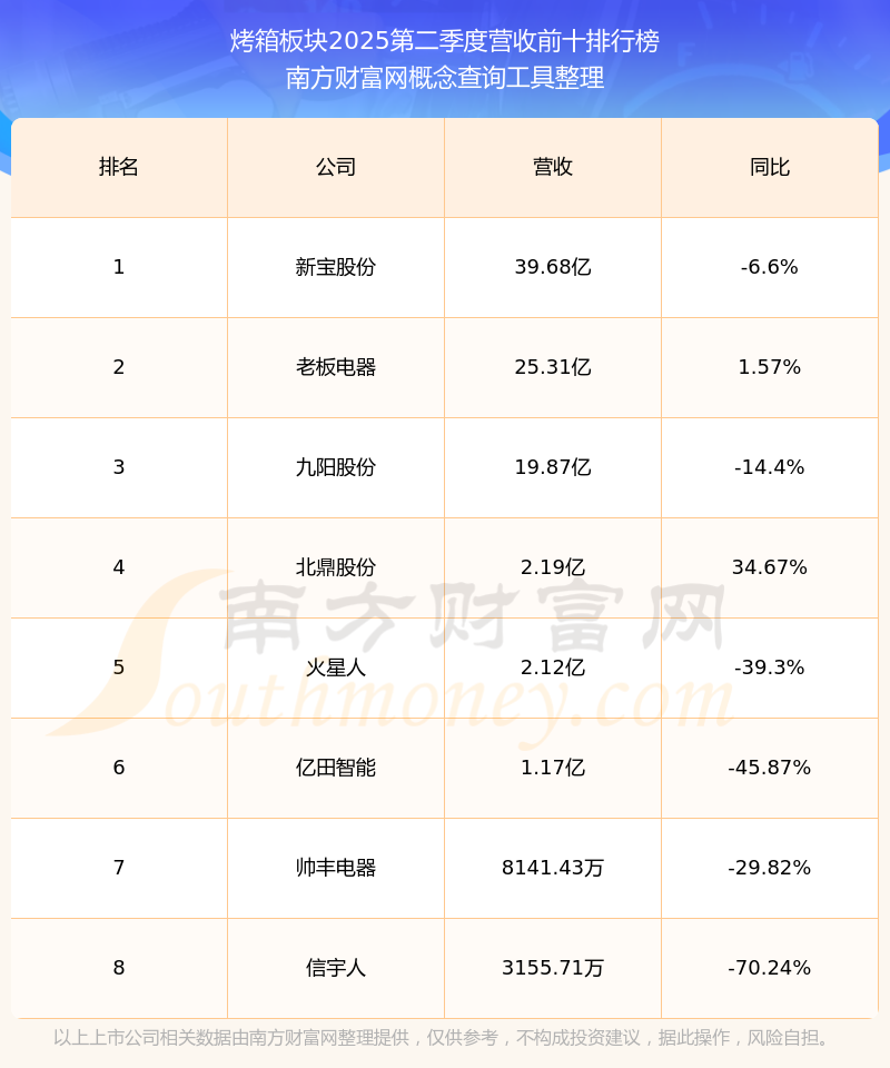 按照南方财富网概念查询工具统计,该股所属板块为烤箱板块,该板块共有8只股票,比依股份2025第二季度营收在该板块中排名为第8名,该板块2025第二季度营收排名前十的股票如下表: