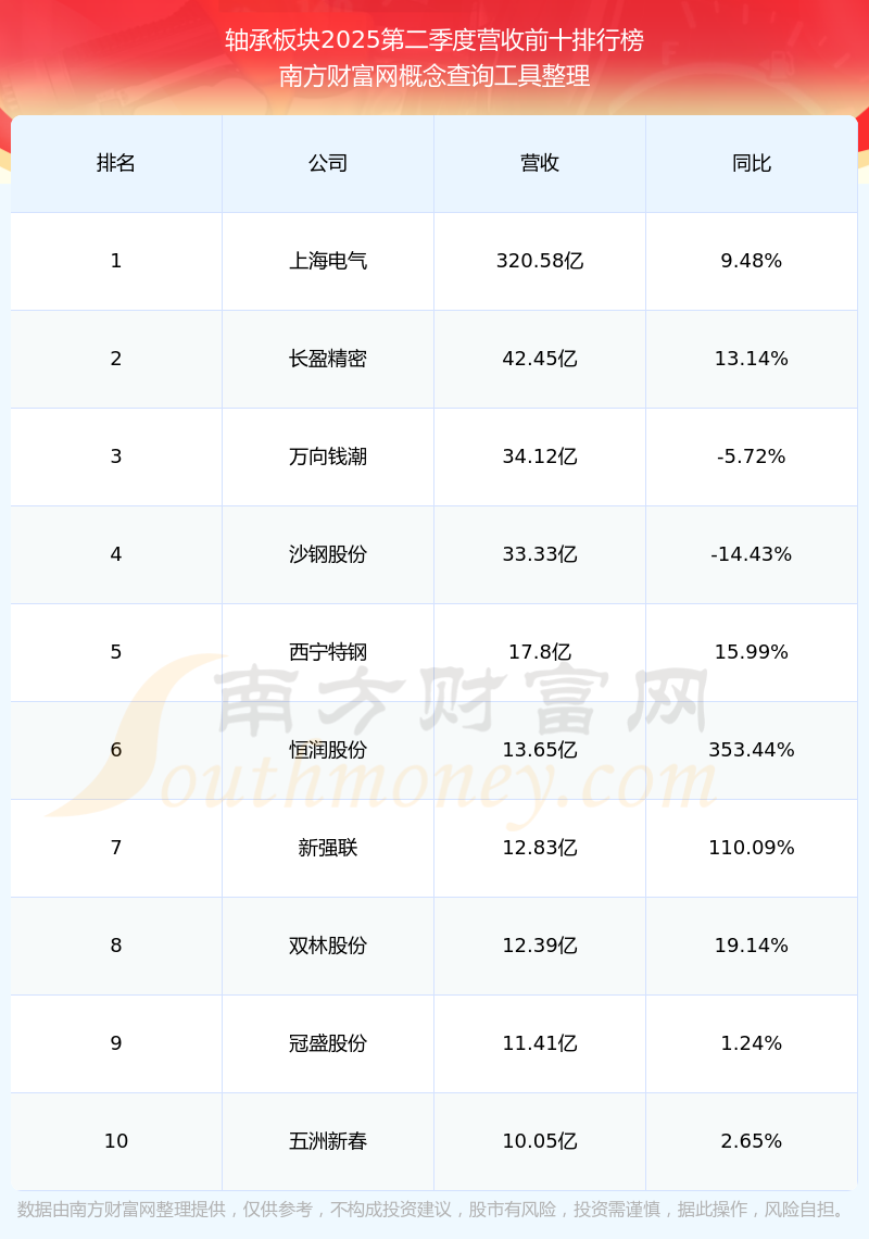 按照南方财富网概念查询工具统计,该股所属板块为轴承板块,该板块共有49只股票,龙溪股份2025第二季度营收在该板块中排名为第25名,该板块2025第二季度营收排名前十的股票如下表: