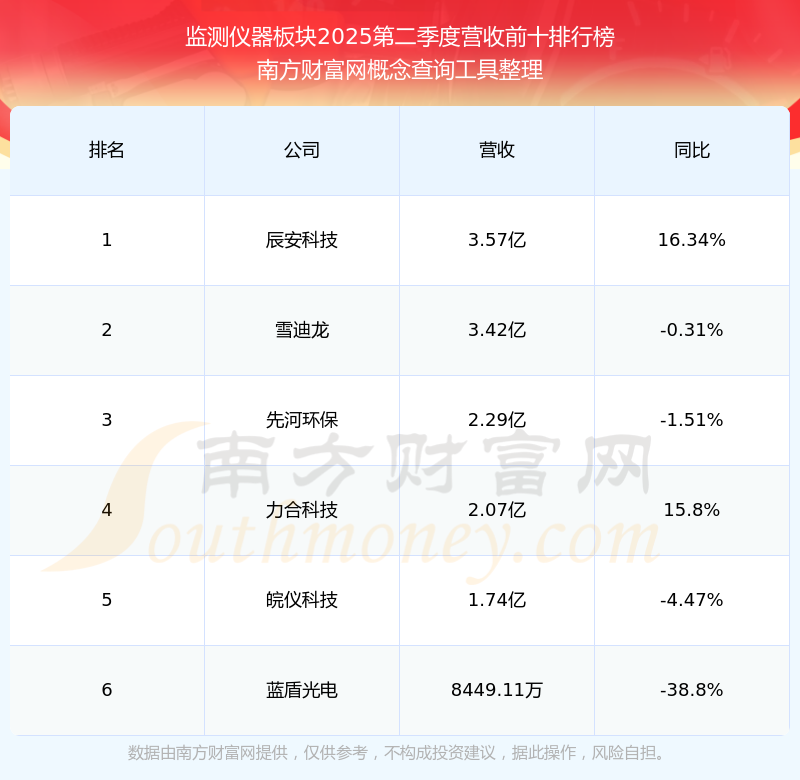 按照南方财富网概念查询工具统计,该股所属板块为监测仪器板块,该板块共有6只股票,禾信仪器2025第二季度营收在该板块中排名为第6名,该板块2025第二季度营收排名前十的股票如下表: