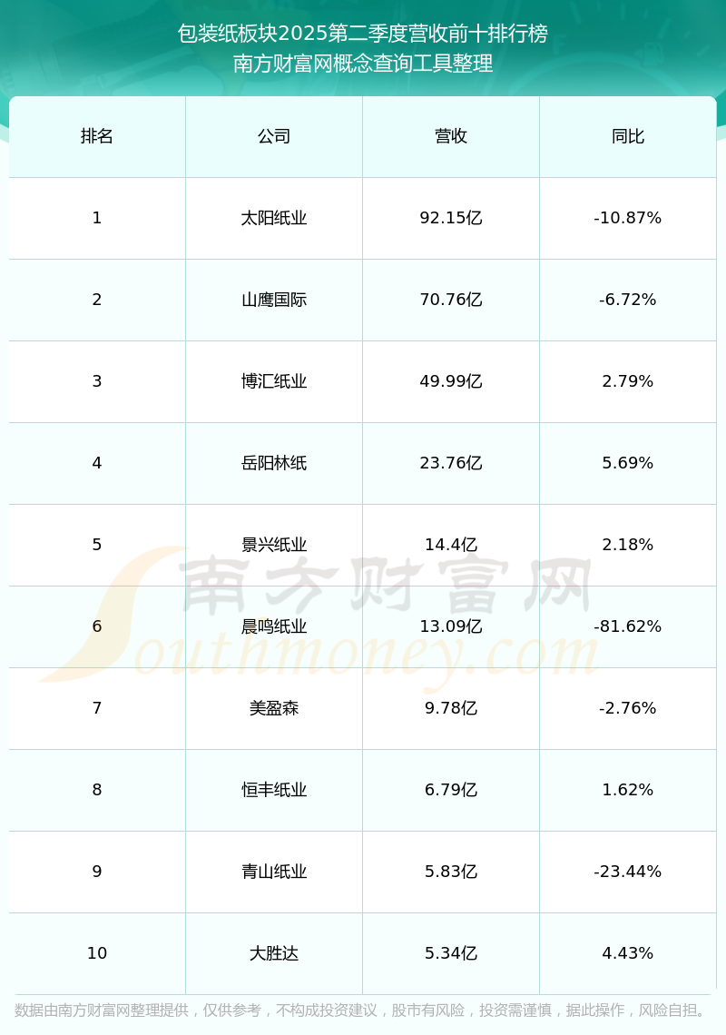 按照南方财富网概念查询工具统计,该股所属板块为包装纸板块,该板块共有15只股票,华泰股份2025第二季度营收在该板块中排名为第15名,该板块2025第二季度营收排名前十的股票如下表: