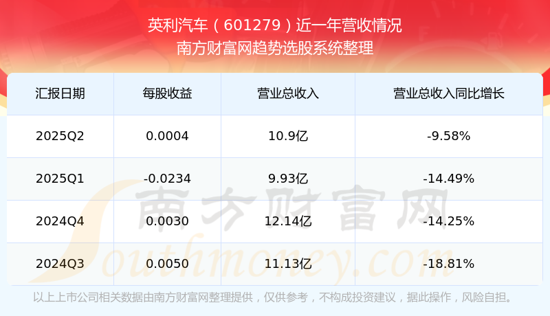 英利汽车发布2025年第二季度财报。实现总营收10.9亿元,同比增长-9.58%;扣非净利润同比增长-119.86%至-183.08万元。