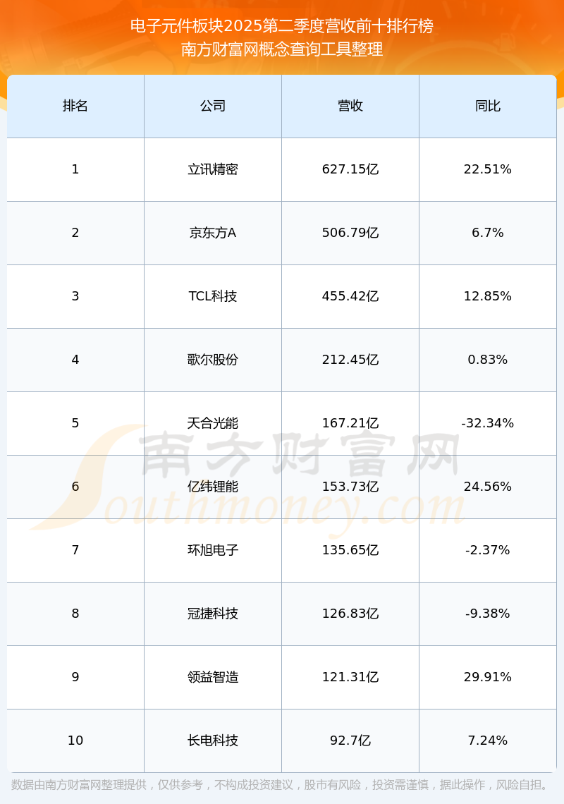 按照南方财富网概念查询工具统计,该股所属板块为电子元件板块,该板块共有367只股票,旭光电子2025第二季度营收在该板块中排名为第199名,该板块2025第二季度营收排名前十的股票如下表: