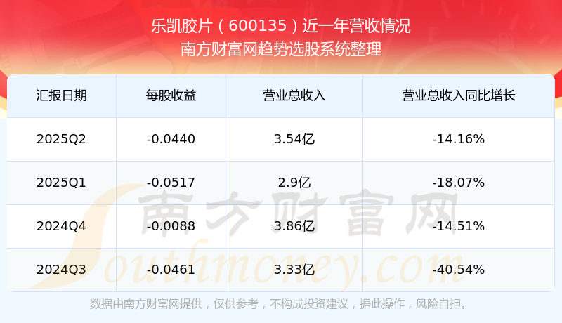 于2025年第二季度,乐凯胶片披露了其业绩表现,其中主营业务收入3.54亿元,相较于去年同期-14.16%。此外,公司归属于母公司的净利润为-2434.32万元,同比增长了-99.93%。在扣除所有非经常性损益后,净利润-2866.4万元,同比增长-56.75%。