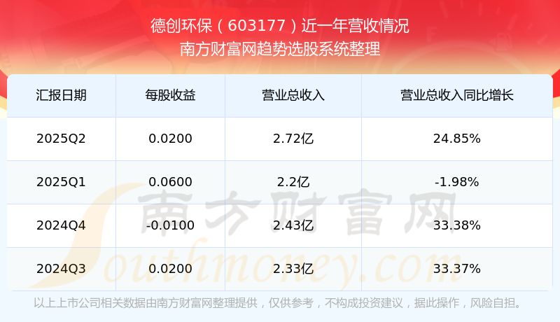 德创环保2025年第二季度财报显示,公司主营收入2.72亿元,同比24.85%;归母净利润647.78万元,同比19.2%;扣非净利润328.88万元,同比-10.89%;