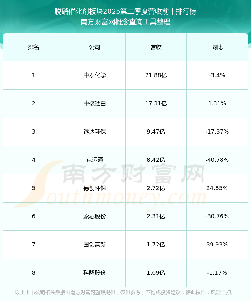 按照南方财富网概念查询工具统计,该股所属板块为脱硝催化剂板块,该板块共有8只股票,德创环保2025第二季度营收在该板块中排名为第5名,该板块2025第二季度营收排名前十的股票如下表: