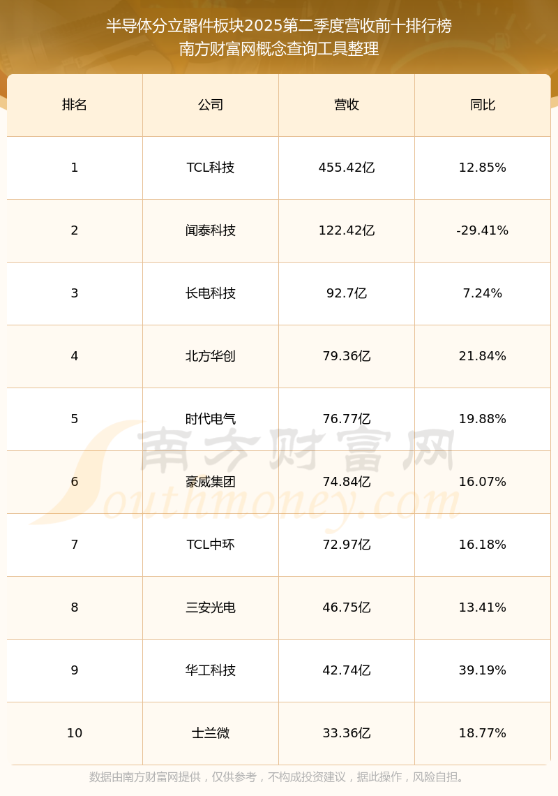 按照南方财富网概念查询工具统计,该股所属板块为半导体分立器件板块,该板块共有67只股票,华微电子2025第二季度营收在该板块中排名为第36名,该板块2025第二季度营收排名前十的股票如下表: