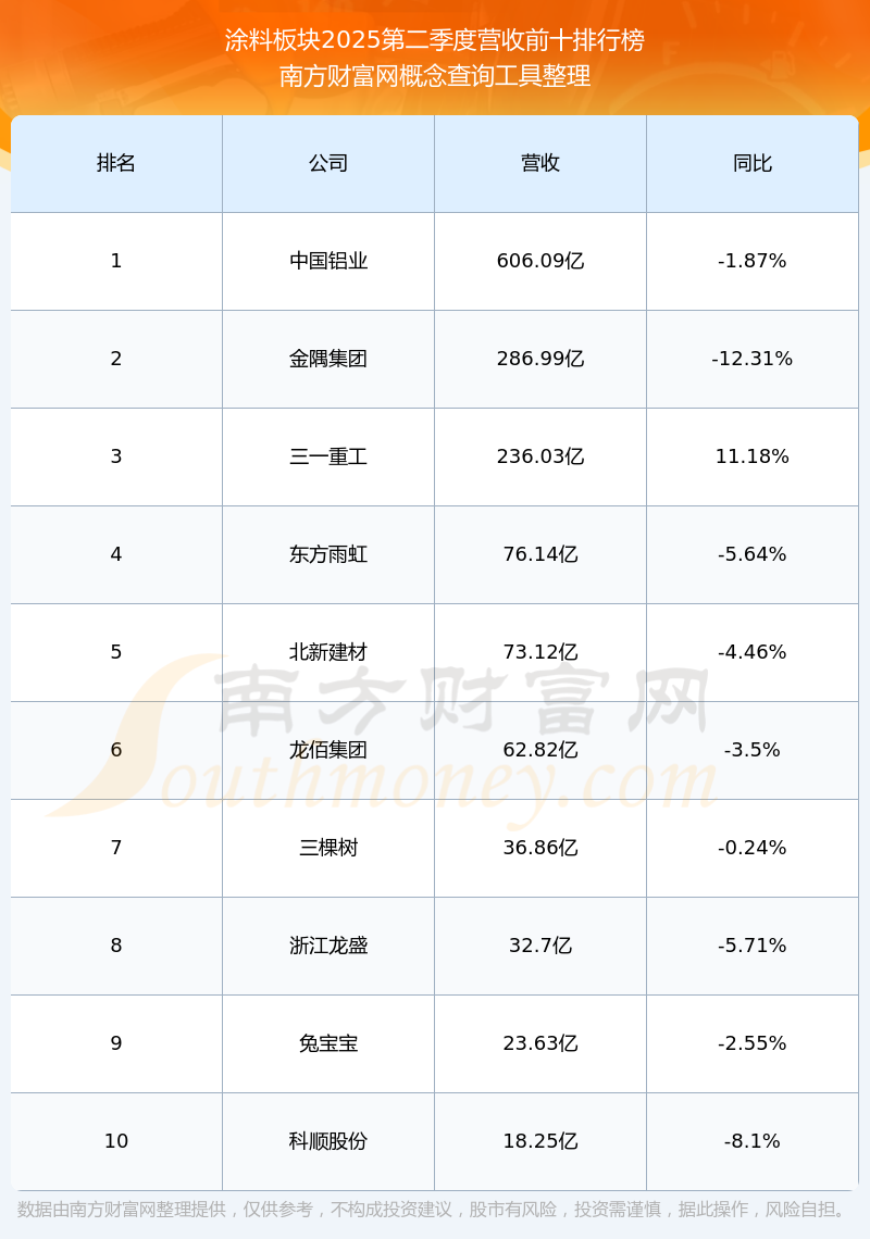 按照南方财富网概念查询工具统计,该股所属板块为涂料板块,该板块共有44只股票,中国电研2025第二季度营收在该板块中排名为第14名,该板块2025第二季度营收排名前十的股票如下表: