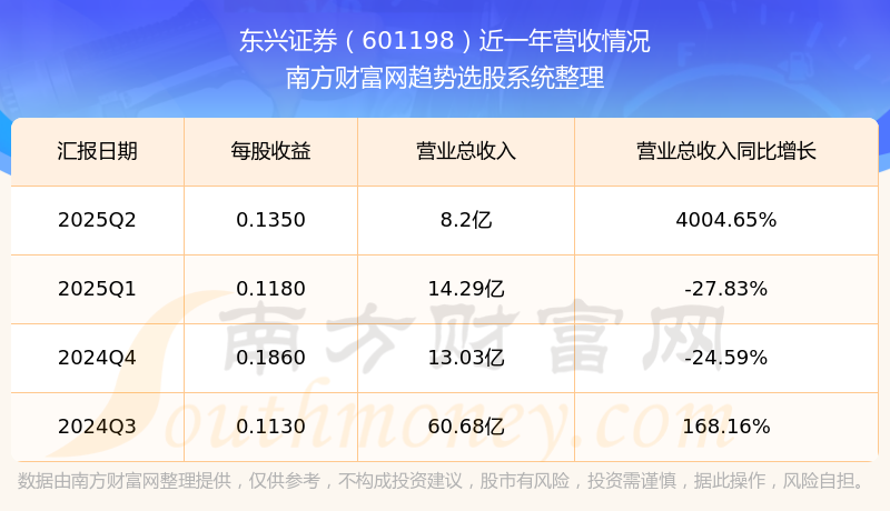 东兴证券(601198)披露2025年第二季度报告,报告期实现营收8.2亿元,同比4004.65%;归母净利润4.39亿元,同比103.55%;扣非净利润4.39亿元,同比101.82%。