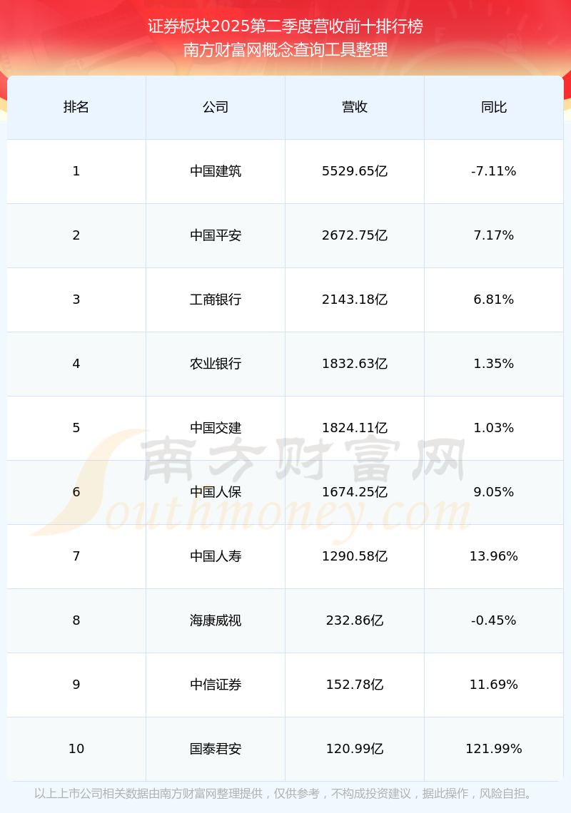 按照南方财富网概念查询工具统计,该股所属板块为证券板块,该板块共有65只股票,东兴证券2025第二季度营收在该板块中排名为第44名,该板块2025第二季度营收排名前十的股票如下表: