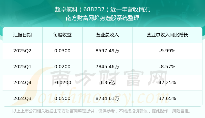 在2025年第二季度,超卓航科的业绩表现,主营业务收入达到8597.49万元,实现了-9.99%的同比增长率。同时,公司归母净利润录得227.46万元,同比增长220.74%。