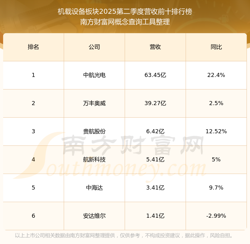 按照南方财富网概念查询工具统计,该股所属板块为机载设备板块,该板块共有6只股票,超卓航科2025第二季度营收在该板块中排名为第6名,该板块2025第二季度营收排名前十的股票如下表: