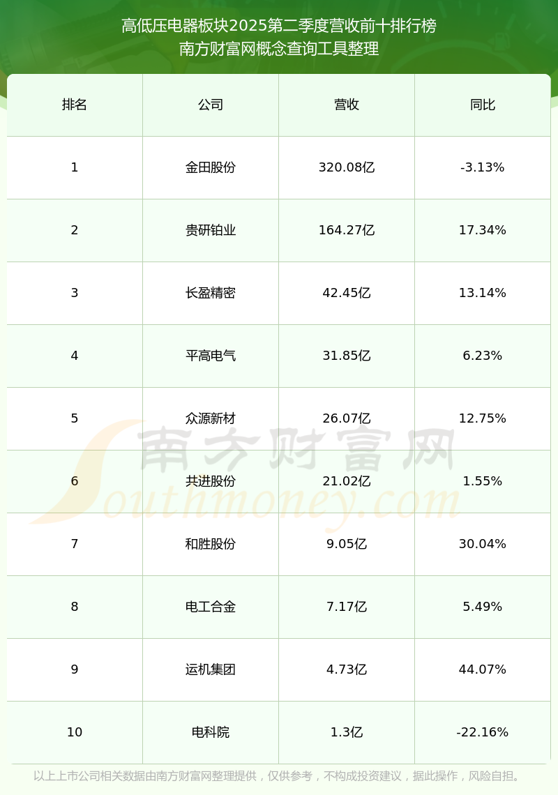 按照南方财富网概念查询工具统计,该股所属板块为高低压电器板块,该板块共有11只股票,百利电气2025第二季度营收在该板块中排名为第11名,该板块2025第二季度营收排名前十的股票如下表: