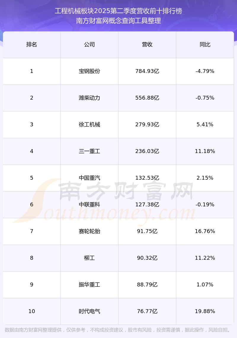 按照南方财富网概念查询工具统计,该股所属板块为工程机械板块,该板块共有100只股票,杭叉集团2025第二季度营收在该板块中排名为第15名,该板块2025第二季度营收排名前十的股票如下表: