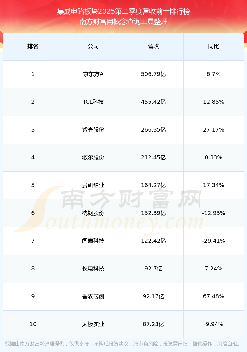 按照南方财富网概念查询工具统计,该股所属板块为集成电路板块,该板块共有193只股票,上海贝岭2025第二季度营收在该板块中排名为第83名,该板块2025第二季度营收排名前十的股票如下表: