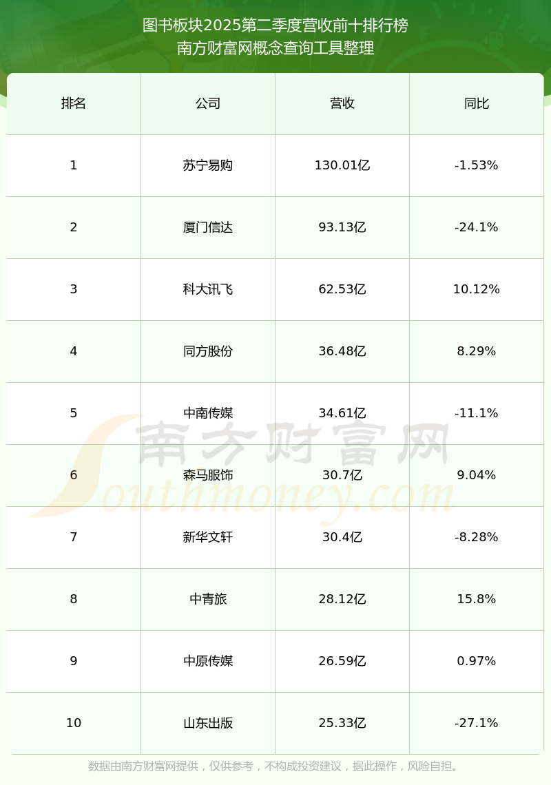 按照南方财富网概念查询工具统计,该股所属板块为图书板块,该板块共有62只股票,龙版传媒2025第二季度营收在该板块中排名为第53名,该板块2025第二季度营收排名前十的股票如下表: