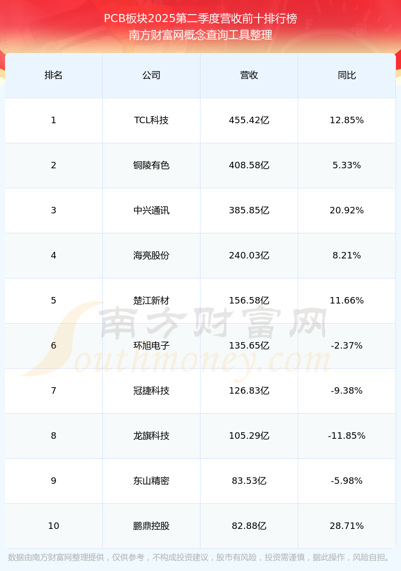 按照南方财富网概念查询工具统计,该股所属板块为PCB板块,该板块共有209只股票,芯碁微装2025第二季度营收在该板块中排名为第125名,该板块2025第二季度营收排名前十的股票如下表: