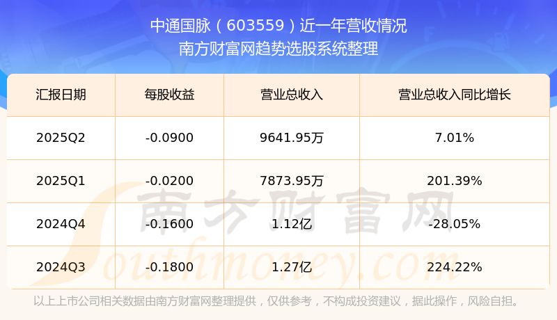 中通国脉2025年第二季度公司实现营业收入9641.95万元,同比7.01%;归母净利润-3457.8万元,同比28.93%。