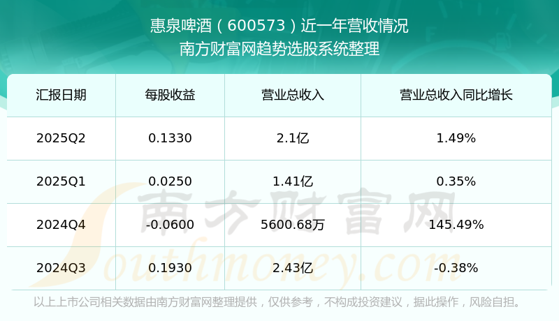 2025年第二季度,惠泉啤酒营收同比1.49%,净利润同比25.86%。