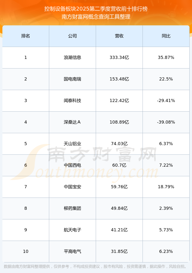 按照南方财富网概念查询工具统计,该股所属板块为控制设备板块,该板块共有66只股票,望变电气2025第二季度营收在该板块中排名为第66名,该板块2025第二季度营收排名前十的股票如下表: